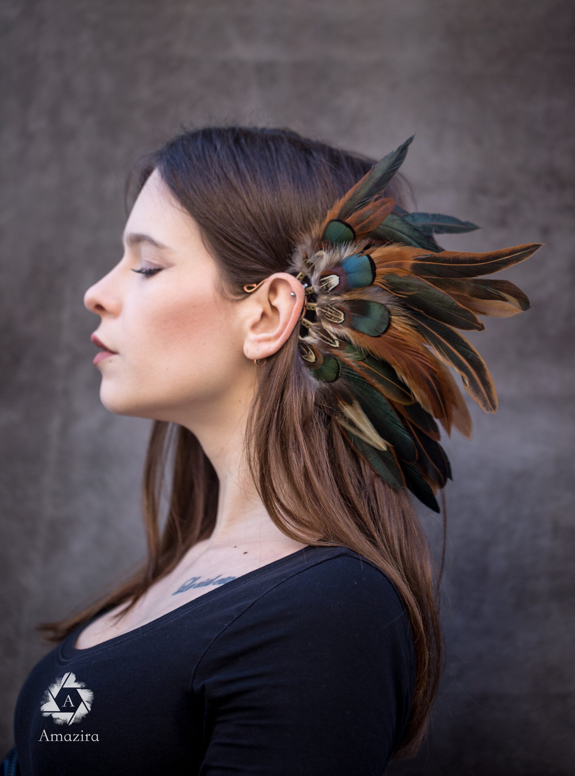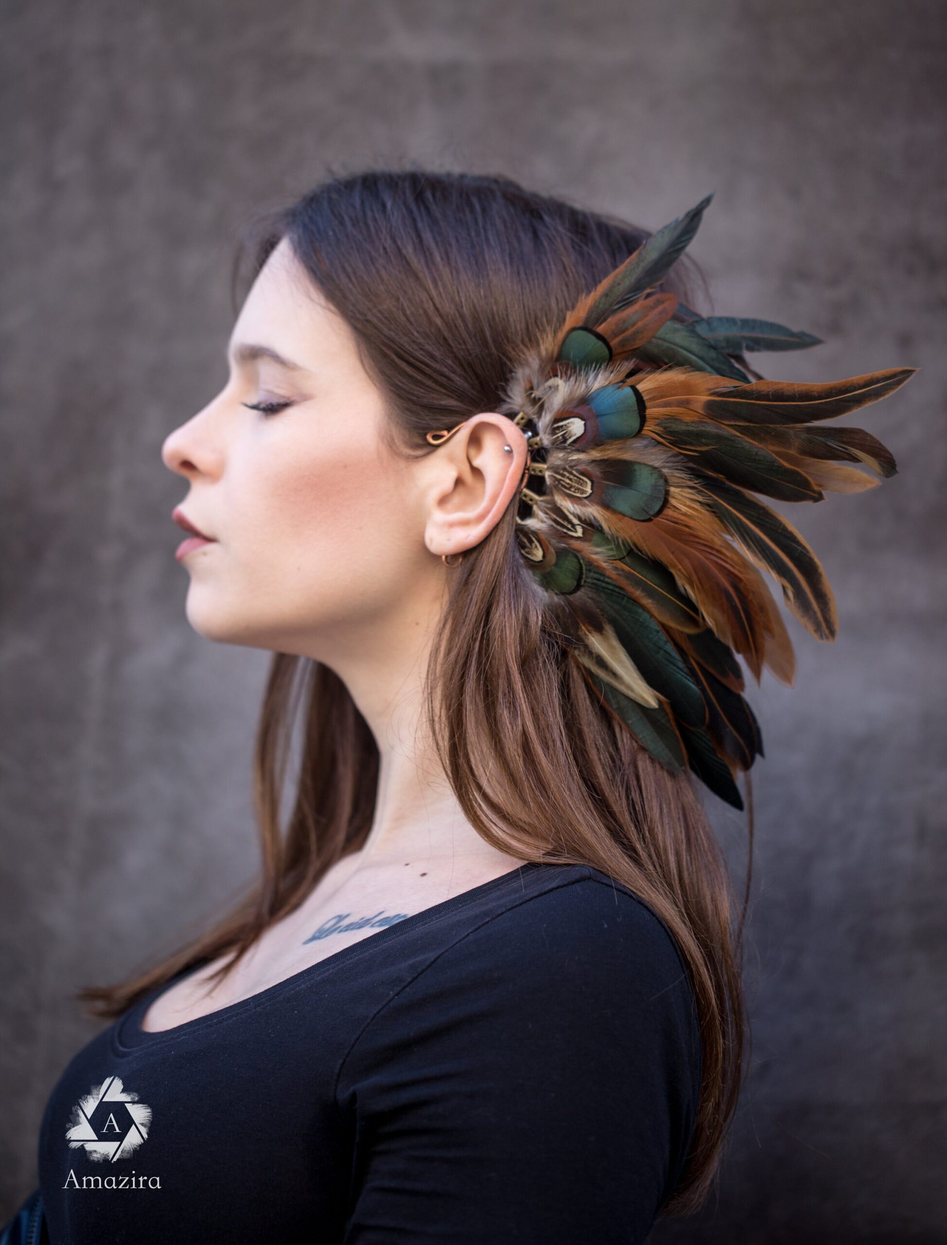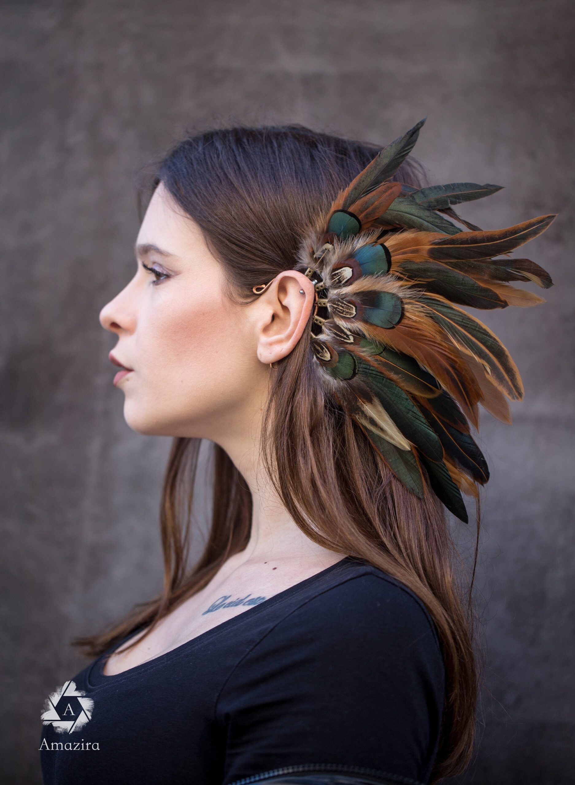 Beautiful natural feathers attached to a lightweight copper wire that hooks around the back and on top of the ear, creating a flow of gorgeous feathers from behind to wear at any occasion.